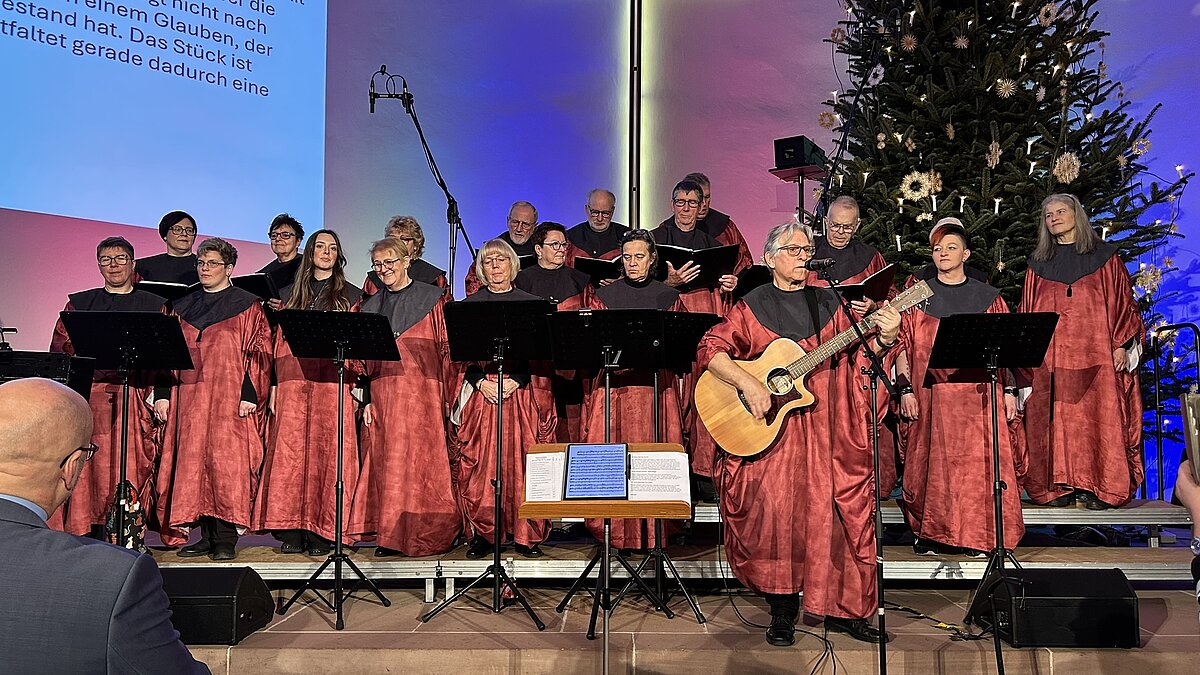 In der Lutherkirche das Offene Singen "Komm vorbei-Sing mit!" in neuem Format: Eingebettet in einen Gottesdienst, diesmal sogar mit einer Taufe. Gestaltet wurde es von Wolf-Rüdiger Schreiweis und seinen Churchies.