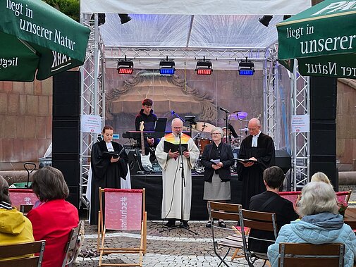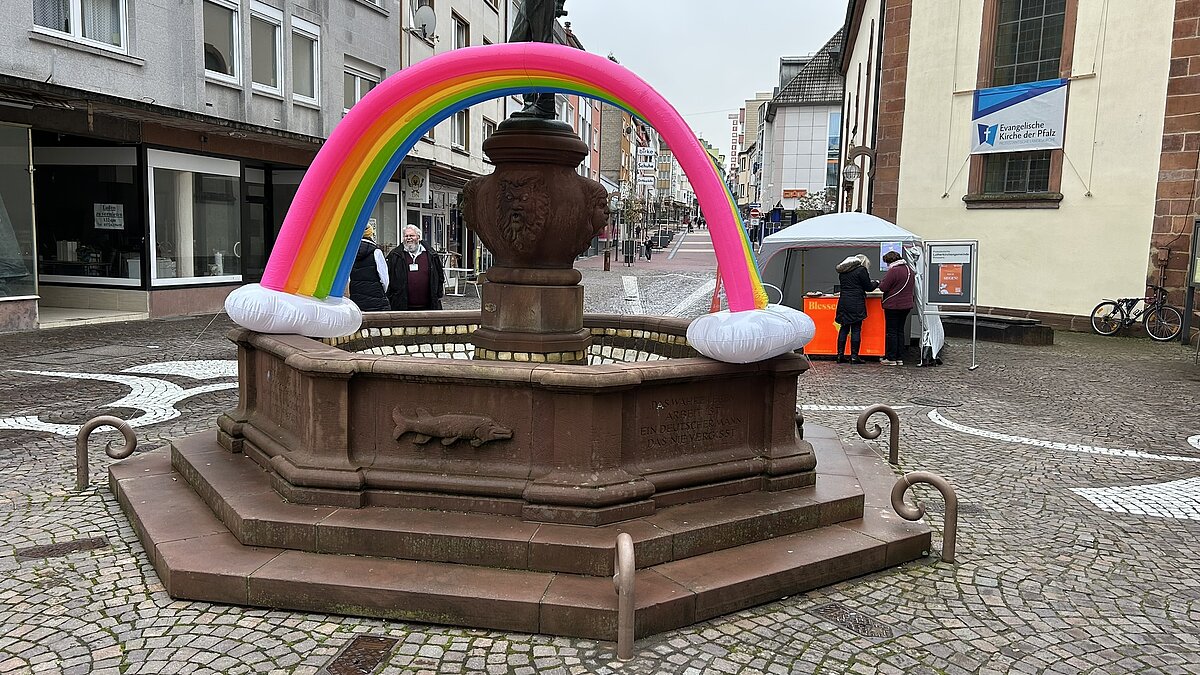 Auf dem Schusterbrunnen hatte Pfarrerin Diemut Meyer vom Segensbüro Blessed. Pfalz ihren Regenbogen aufgestellt und bot in einem kleinen Pavillon vor der Kirche Pop-Up-Segnungen für Interessierte an .