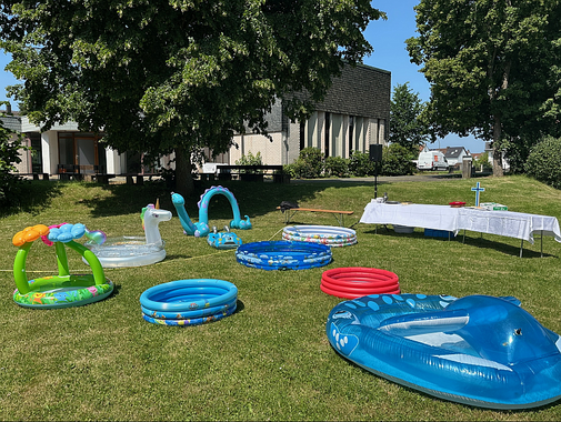Sie hatten alle Zeit - Donnerstag, 19. Juni, 14 Uhr. Keine Schule. Keine Arbeit. Vielmehr trafen sich 6 Familien aus unterschiedlichen Gemeinden der Stadt. Um ihr/e Kinder taufen zu lassen. Und manche Mutter & Pat:in ließ sich auch taufen. Segnen. So konnte das Team um Achim Bißbort (Musik), Pfarrer Martin Bach (Predigt), Gemeindepädgagoge Manfred Vogel (Liturgie) und Pfarrer Wolfdietrich Rasp bis zu 100 Personen am Gemeindezentrum Kirchberg begrüßen - aus allen Generationen und Gemeinden. Die Kinder entdeckten bald die Planschbecken - und so taufte Pfarrer Wolfdietrich Rasp in diesen 12 große und kleine Kinder. Planschend. Spritzend. Quirlig. Lebendig. Segnete Kinder und Eltern. Ein fröhlich-spritziges Fest des Lebens mit toller musikalischer Untermalung und Rahmung. An einem wunderschönen Platz.