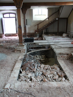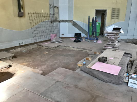 Alles muss raus: Die ersten Tage der Renovierung standen unter diesem Motto. Zuerst mussten die Bänke weichen, dann wurden die Holzpodeste abgebaut und die Steinplatten abgetragen. Darunter kam jede Menge Sand und Schutt zum Vorschein - und auch so manche Überraschung! Unter anderem eine Jahrzehnte alte Fischdose wurde geborgen und wartet nun gemeinsam mit einigen anderen Fundstücken darauf, nach der Renovierung einen Ehrenplatz zu erhalten und als Anekdote zum Schmunzeln vom Umbau 2017 zu erzählen.