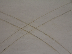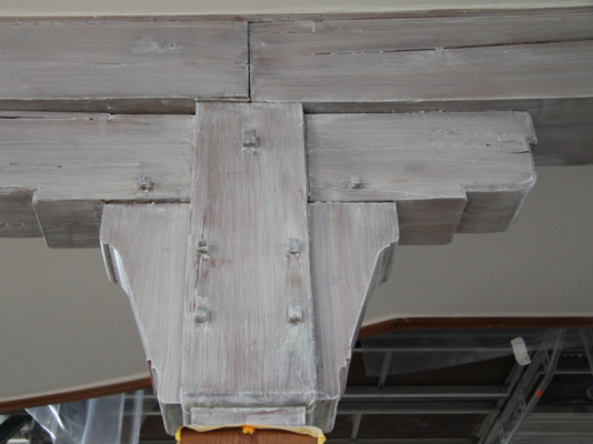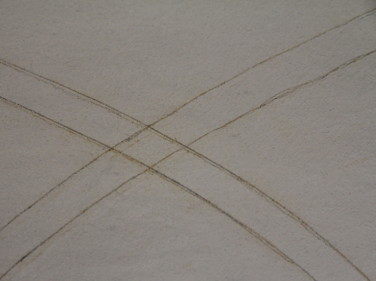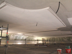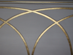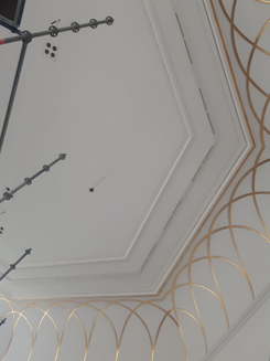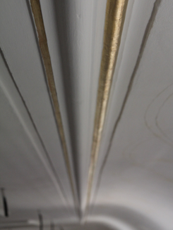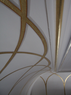... in unsere Kirche - zumindest an manchen Stellen. Nachdem die Wände und die Decke weiß gestrichen wurden, haben die Maler nun goldene Akzente gesetzt. Ein Muster zieht sich entlang der Voute, dem abgerundeten Übergang von den Wänden zur Decke. Damit nichts daneben geht, wurde der Verlauf zuerst vorgezeichnet, bevor er mit Gold ausgemalt wurde.
