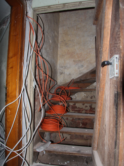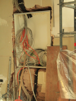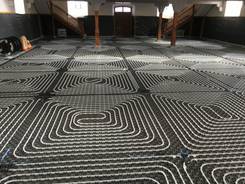 Außerdem wurde fleißig an der Elektrik und der Heizung gebaut, deren Elemente in der Wand bereits fertig sind, während die Heizspiralen auf dem Boden für die Fußbodenheizung noch fehlen.