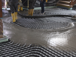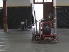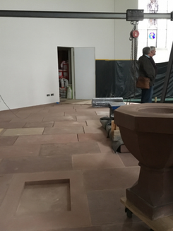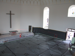 So langsam kann man sich schon vorstellen, wie unsere Kirche nach dem Abschluss der Renovierungsarbeiten aussehen wird. Das Gerüst der Maler ist verschwunden und nun ging es an den Fußboden. Dazu wurden zunächst die Heizspiralen für die Fußbodenheizung außerhalb des Altarraums verlegt. So muss in Zukunft auch im Winter kein Kirchenbesucher mehr kalte Füße fürchten. Anschließend rückte ein großes Mischfahrzeug an und dann wurde der Estrich durch einen langen Schlauch in die Kirche gepumpt, gleichmäßig verteilt und eingeebnet. Auch unser Altarraum hat schon wieder altgewohnte Formen angenommen: Der Altar mit seinem neuen Untergestell und der Taufstein wurden wieder an ihren Platz gestellt und auch das Kreuz über dem Alter hängt schon wieder an seinem Platz.