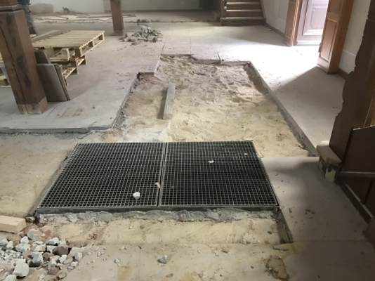 In den vergangenen beiden Wochen ist in der Lutherkirche viel passiert: Der Boden wurde ausgekoffert, das heißt er wurde ausgehoben bis zur Koffersohle. Dabei wurde jede Menge Staub und Dreck herausgeholt und abgetragen, sodass zum Teil die darunterliegende Konstruktion zum Vorschein kam und beispielsweise die Mauern des Grabs von Landgraf Ludwig zu erkennen waren. Außerdem wurden die Heizungsschächte auf- und abgebrochen und anschließend verfüllt, da diese in Zukunft beim neuen Heizsystem nicht mehr benötigt werden. Unser Altarraum steht derweil verwaist da: Der Altar wurde abgenommen und die Plattenlegung unter dem Tisch vorbereitet. Außerdem kam es zu einem wohl einmaligen Bild: Frontal vor der Eingangstür der Kirche stand am frühen Morgen ein Fahrmischer und ließ die erste Schicht des neuen Bodens in die Kirche ab.