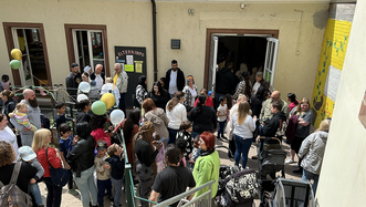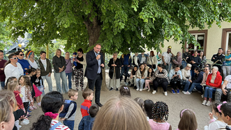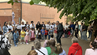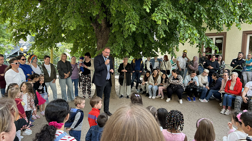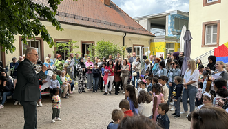 Eröffnet wurde die Geburtstagsfeier, direkt nach dem Ein-Uhr-Schlag der benachbarten Lutherkirche, von Franziska Ertel der KiTa-Leiterin. Danach sange die Kindergartenkinder das Lied "Im Kindergarten" unter der Gitarrenbegleitung von Anja Zimmermann. Es folgten Grußworte von Dekan Ralph Krieger, Oberbürgermeister Markus Zwick und Landesdiakoniepfarrer Albrecht Bähr.