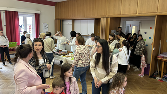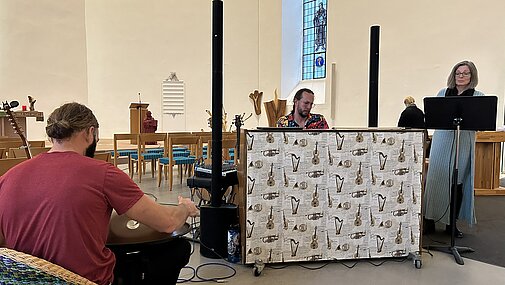 Bei verschiedenen Mitmach-Aktionen rund um Klänge und Rhythmus konnte die ganze Gemeinde das Thema hautnah miterleben. Im Anschluss lud ein von den Familien der Kindergottesdienst-Kinder vorbereitetes Kirchencafé zum Verweilen ein, außerdem konnten alle noch verschiedene Instrumente ausprobieren