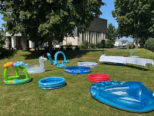 Sie hatten alle Zeit - Donnerstag, 19. Juni, 14 Uhr. Keine Schule. Keine Arbeit. Vielmehr trafen sich 6 Familien aus unterschiedlichen Gemeinden der Stadt. Um ihr/e Kinder taufen zu lassen. Und manche Mutter & Pat:in ließ sich auch taufen. Segnen. So konnte das Team um Achim Bißbort (Musik), Pfarrer Martin Bach (Predigt), Gemeindepädgagoge Manfred Vogel (Liturgie) und Pfarrer Wolfdietrich Rasp bis zu 100 Personen am Gemeindezentrum Kirchberg begrüßen - aus allen Generationen und Gemeinden. Die Kinder entdeckten bald die Planschbecken - und so taufte Pfarrer Wolfdietrich Rasp in diesen 12 große und kleine Kinder. Planschend. Spritzend. Quirlig. Lebendig. Segnete Kinder und Eltern. Ein fröhlich-spritziges Fest des Lebens mit toller musikalischer Untermalung und Rahmung. An einem wunderschönen Platz.
