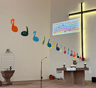 Am 15. Juni fand in der Lutherkirche ein fröhlicher und musikalischer Familiengottesdienst unter dem Motto „Du bist ein Ton in Gottes Melodie“ statt. Sieben Kinder des Kindergottesdienstes gestalteten gemeinsam mit dem KiGo-Team einen den Gottesdienst. In der mit selbstgebastelten Noten geschmückten Kirche sangen die Kinder mit großer Begeisterung mehrere Lieder, außerdem zeigten sie mit dem Anspiel „Der kleine Ton C“, welche Bedeutung jeder einzelne Ton in Gottes großer Melodie spielt.